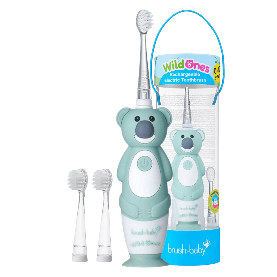 Brush-Baby WildOnes elektriline hambahari väikelastele KOAALA “Kylie”, mis efektse kujuga, mugav, töökindel ning kus hambahari harjamise käigus teeb erinevaid valgusefekte. 1 käepide (2 tugevus-režiimi) 3 harjapead (pehmete harjastega) Sisseehitatud vastupidav aku USB laadija