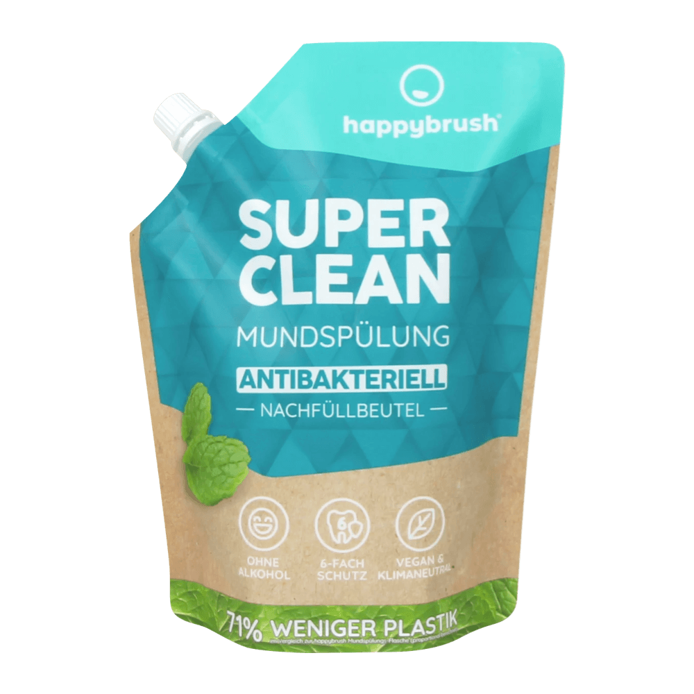happybrush SUPER CLEAN suuvesi on supervärskendav, kus antibakteriaalne piparmündi koostis hellitab Sinu hambaid ja hoolitseb igemete eest. Sisaldab naatriumfluoriidi (450 ppm). Sobib ainult täiskasvanutele. Ilma mikroplastita. Antibakteriaalne, vegan Ksülitooliga, Kaariese eest kaitse Hingamisteede tervise eest kaitse Plekkide eemaldamine Halitoosi vähendamine