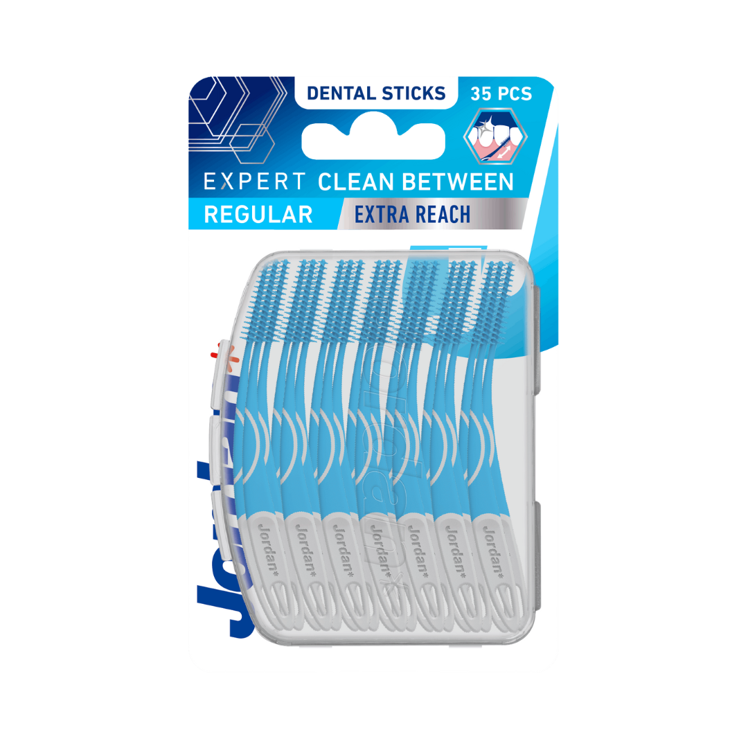 Jordan Expert Clean Between Regular kummiste harjastega hambatikud õrnaks puhastamiseks ja igemete massaažiks. Eemaldab katu ja toiduosakesed Masseerib igemeid Parem ulatus ja kontroll Mugav reisikarp