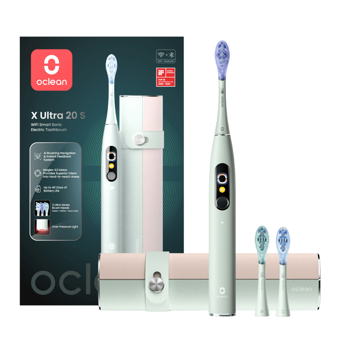 Oclean X Ultra 20 on kõige uuema põlvkonna WiFi ühendusega elektriline hambahari, mis juhendab Sind tehisintellekti ja häälkäskluste abil igemete kaitsmiseks ja harjamisharjumuste parandamiseks. 1 käepide (5 režiimi) 3 otsikut (Clean, White, Gum Care) Laadija (kaabliga) Reisivutlar (laadimisfunktsiooniga) Seinahoidja Puutetundlik ekraan Väga vaikne (45dB) Surveanduriga (visuaalne) Aku kuni 40 päeva