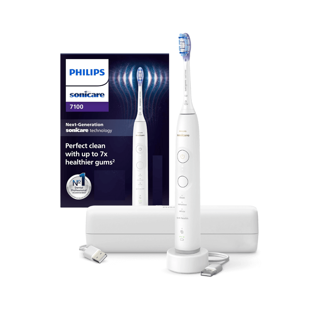 Philips Sonicare 7100 elektriline hambahari Next Generation Sonic-tehnoloogiaga hoolitseb Sinu terve suu eest, pakkudes nutikat ja tõhusat suuhooldust. 1 käepide (4 režiimi, 3 tugevust) 1 otsik (G3 Premium Gum Care) Reisivutlar (laadimisfunktsiooniga) Laadija Tasuta lisagarantii +1 aasta (Registreeri)