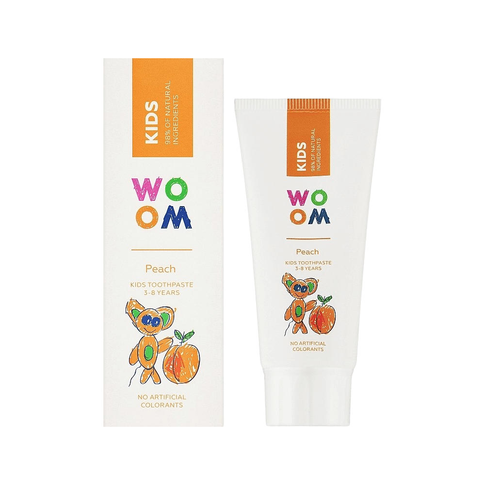 Woom KIDS Peach fluoriidiga hambapasta 3–8-aastastele lastele 98% looduslike koostisosadega. Hambapasta lastele Tugevdab hambaid Kaitseb kaariese eest Sisaldab fluoriidi (450 ppm F)